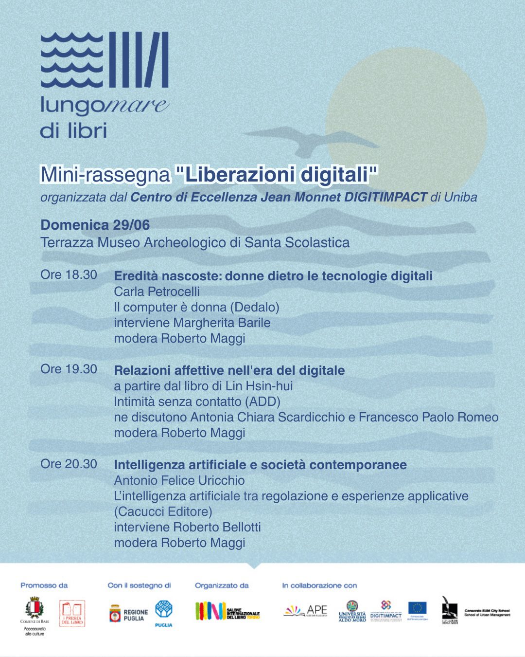 Il Centro di Eccellenza Jean Monnet DIGITIMPACT e la Sezione Terza Missione dell’Università di Bari propongono il 29 giugno 2025 una mini-rassegna di tre appuntamenti all’interno della manifestazione “Lungomare di Libri”, presso la Terrazza Museo Archeologico di Santa Scolastica